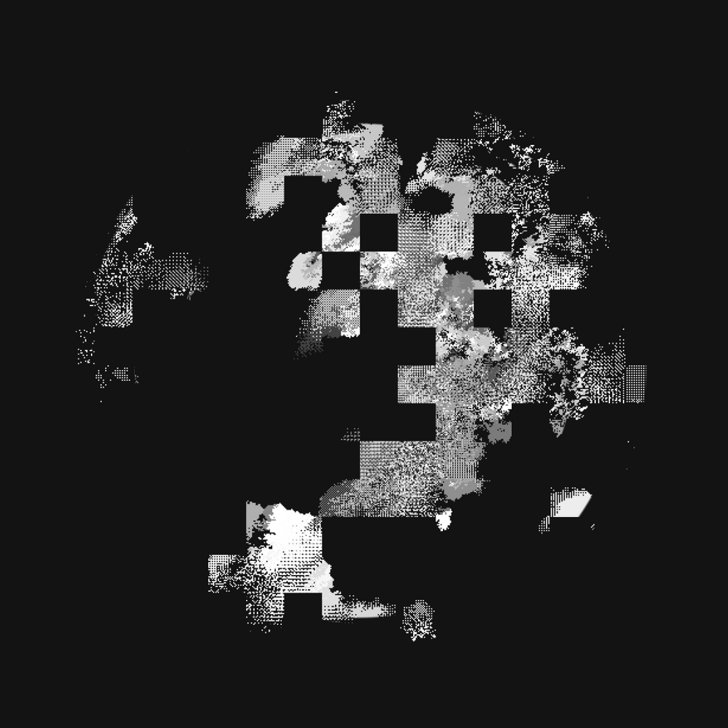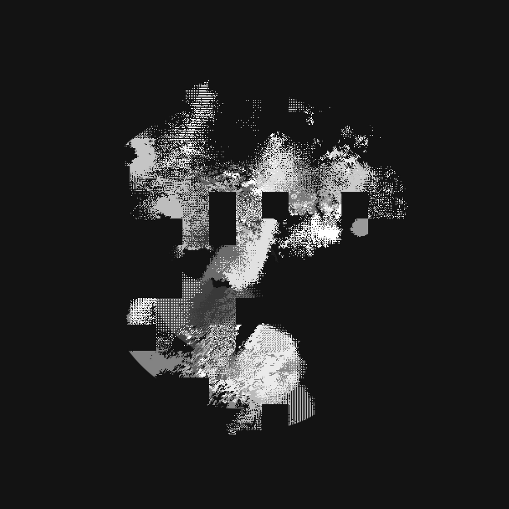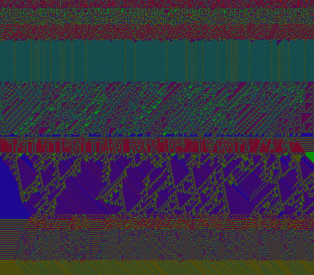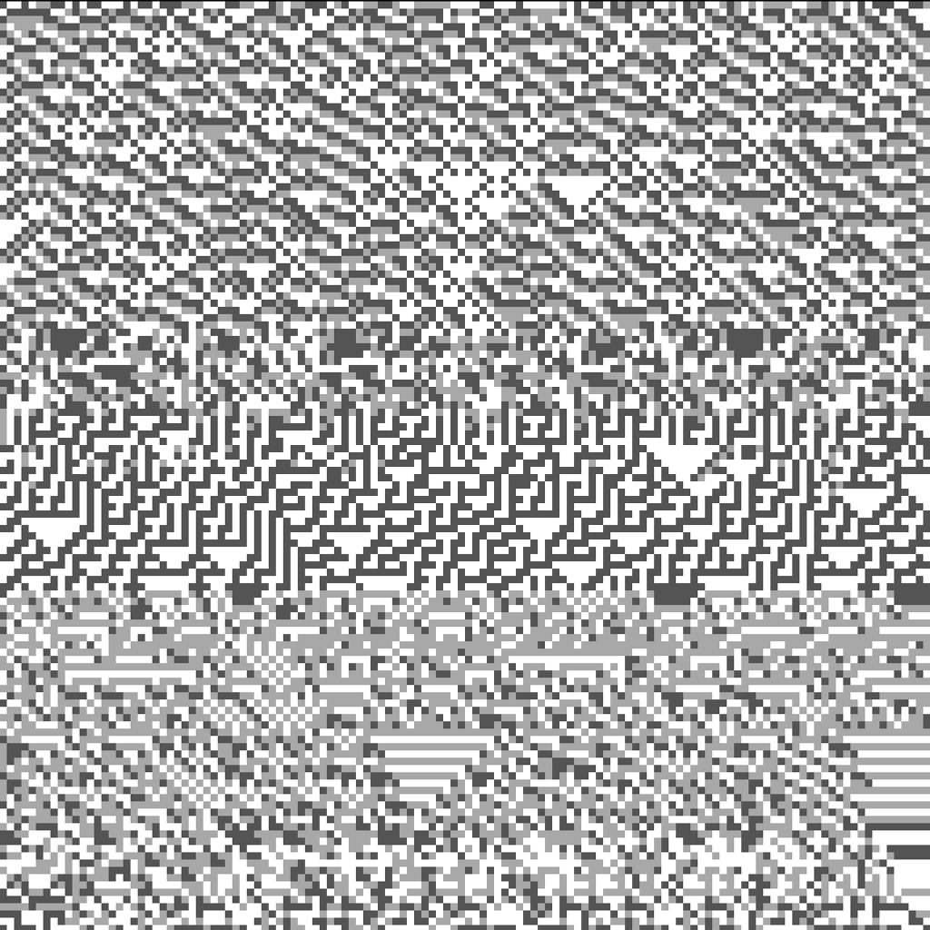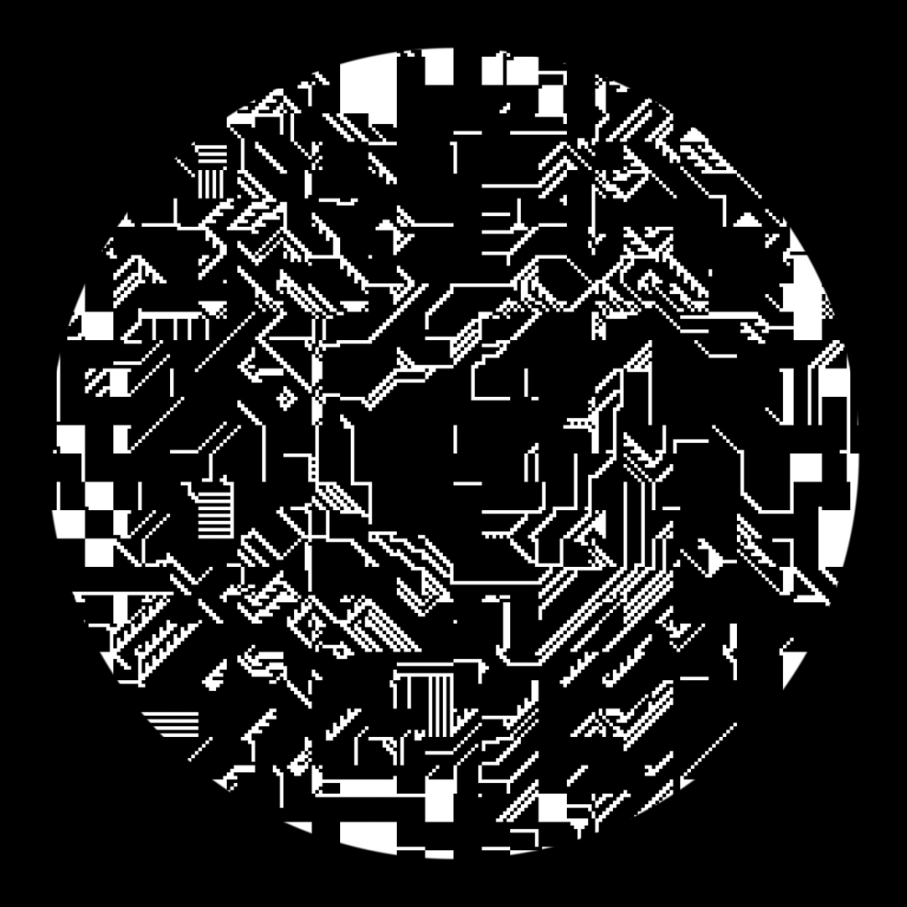 I wanted to explore alternative forms to the classical top-to-bottom/bottow-to-top scanline growing behaviour in cellular automatons. These experiments use a grid of fields, where each field is initialized with different rules, growing directions and settings. The system combines two different variations: classical elementary cellular automata rules and a copy-pixel/plasma rule, which takes pixels from the neighborhood with a noise-controled offset like a stamp.