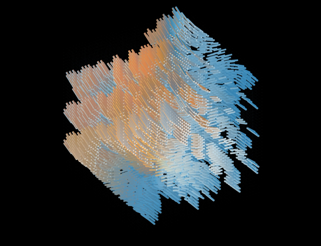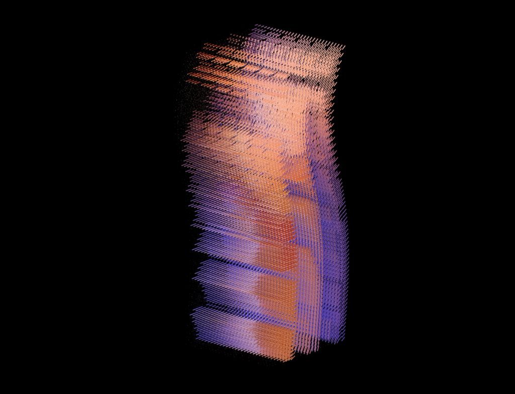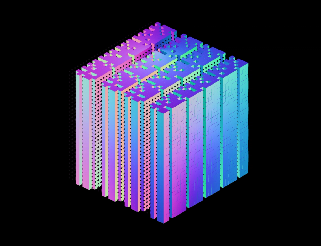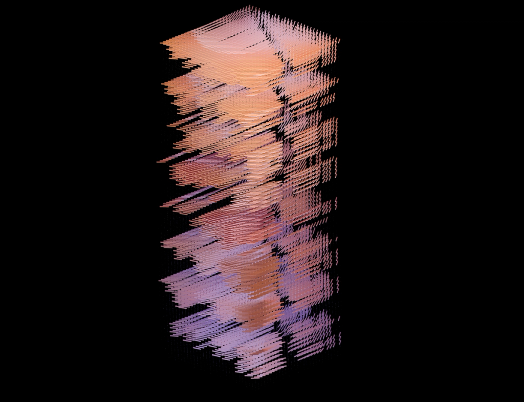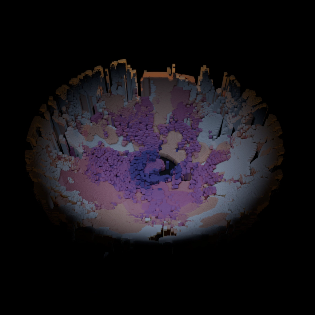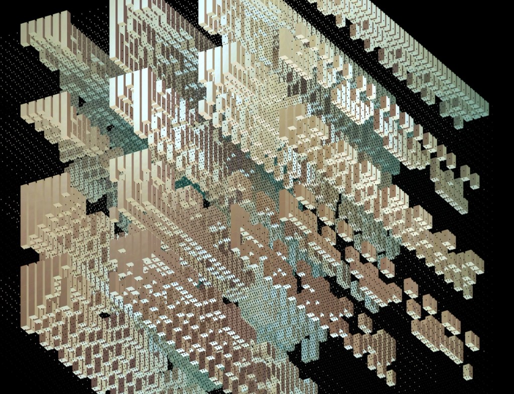 I wanted to explore alternative forms to the classical top-to-bottom/bottow-to-top scanline growing behaviour in cellular automatons. These experiments use a grid of fields, where each field is initialized with different rules, growing directions and settings. The system combines two different variations: classical elementary cellular automata rules and a copy-pixel/plasma rule, which takes pixels from the neighborhood with a noise-controled offset like a stamp.